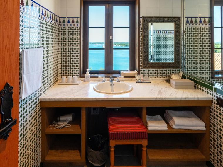 さらに、海を眺めながらのバスタイムは至福のひととき。広々とした洗面台や、アラビックな幾何学模様のタイル装飾が、異国のスパにいるような非日常気分を演出してくれます。