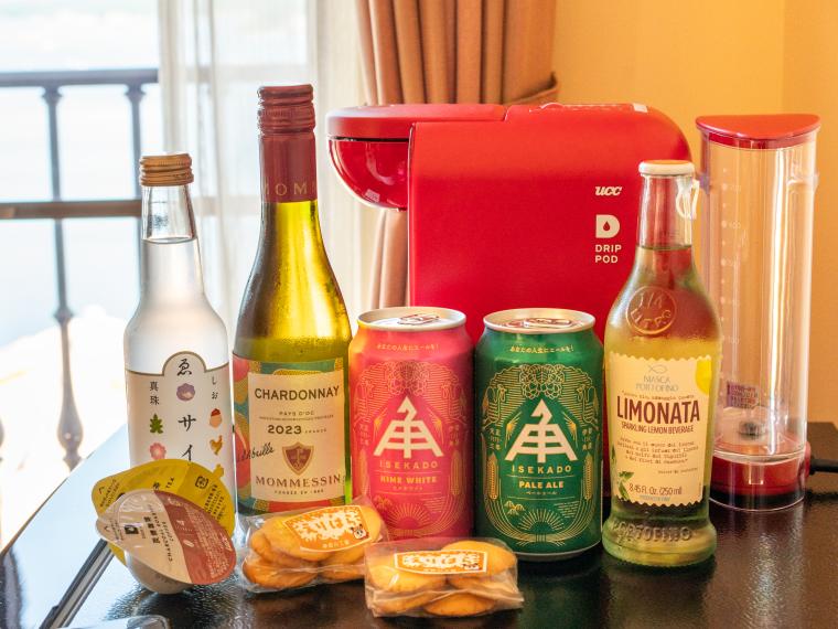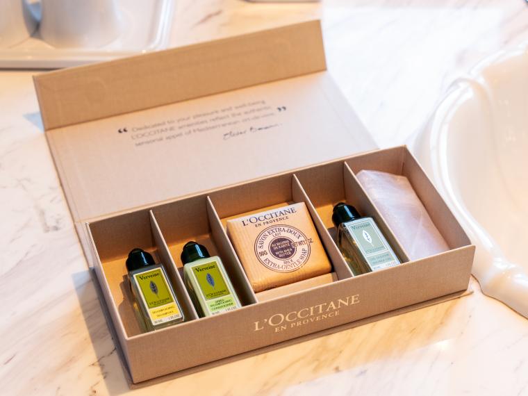 ラグジュアリータイプのお部屋には、特別なアメニティも。例えば、シャンプー・コンディショナーはロクシタンのものに。そして、冷蔵庫内のアルコールやドリンクは無料で楽しめるミニバーになっています。