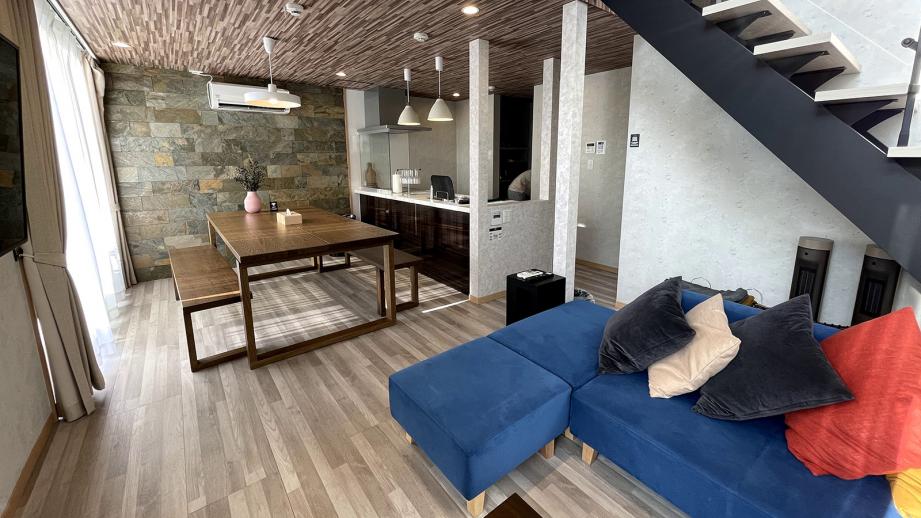 今回宿泊したのは101号室ですが、全棟が同様にメゾネットタイプの2LDK。約87平米の広さを誇り、最大10名までの宿泊が可能です。ホテルなどではなかなか体験できないこの広さをまるっと貸し切り利用できるのだから、なんとも贅沢! 胸も高鳴ります。