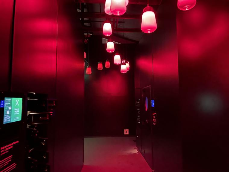 更衣室を出ると、館内の人の動きに呼応して色が変わるランプがぶら下がった待ち合いスペースが用意されています。同展は男女一緒でも楽しめるように企画されていて、着替えた後にここで合流してサウナ室へ向かえるようになっています。