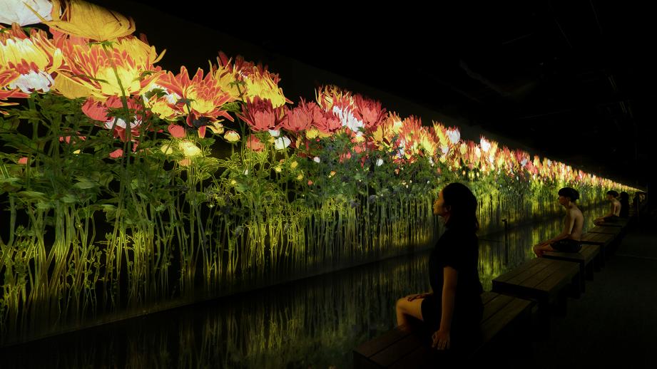『降り注ぐ雨の中で増殖する無量の生命』は、空間の壁面いっぱいに咲いては散る花々がデジタル映像で映し出されます。花は向き合った人の動きで変化し、その瞬間だけにしか見ることのできない絵になります。