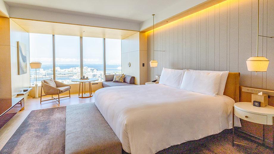 プレミアムキングは3つのビューから選択でき、「ベイビュー」は博多湾や島々が見える眺望の良さが魅力。ザ・リッツ・カールトン福岡はすべて高層階に客室があり、周りに高い建物がないため、どの客室からも美しい福岡の風景を眺めることができます。