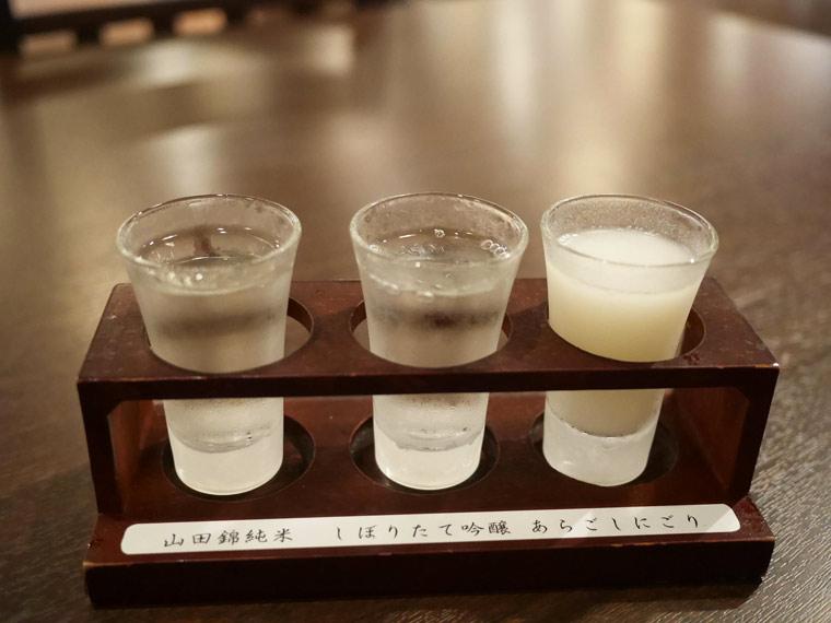 レストランでは日本酒の飲み比べが可能です。伏見のお酒は、女酒といわれるだけあって、どれもなめらかな飲み口。黄桜では特に、日本酒の原料である「こうじ」造りにこだわり、より香り高いお酒が味わえます。