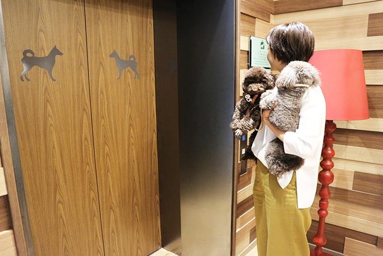 手続きとエチケットケアが終わったら、いよいよ本日滞在する「ドッグフレンドリールーム」へ。 エレベーターホールやエレベーター内では、ワンちゃんは抱っこかカート、キャリーバッグにいれて利用しましょう。
