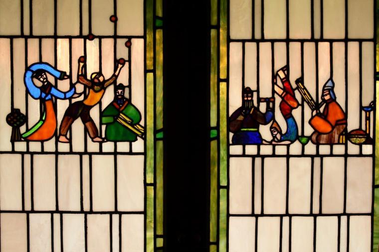 赤いレンガの外観や煙突、カラフルなステンドグラスなどは、まるで西洋のおとぎ話に出てくる家のよう。ステンドグラスには、栄一の喜寿のお祝いの準備をする人々の様子が描かれています。