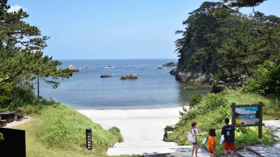 自転車を借りたら早速海に向かいましょう。野伏港(のぶしこう)より自転車で約2分。式根島といえばこの海岸「泊海水浴場(とまりかいすいよくじょう)」。岩に囲まれた入り江がまるで貝殻のようで、フォトジェニックなスポットです。