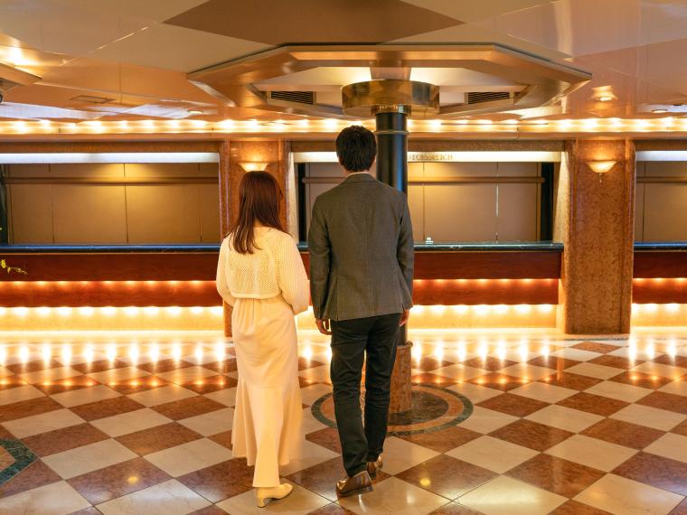 船の中に一歩入ると、豪華なエントランスがお出迎え。気分もさらに華やぎます。まずは、乗船券に記載されているレストラン会場へと向かいましょう。