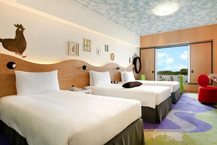 「ヒルトン東京ベイ」の「ハッピーマジックルーム」は、まるで絵本の中に入り込んだかのような客室。お部屋は、リーフグリーンやブルーパープルといった鮮やかで優しい色使いが印象的。天井には青空と雲が描かれ、壁には動物たちが楽しそうに過ごすイラストが施されています。自然の中にいるような開放感と、可愛らしさが絶妙に融合したデザインです。