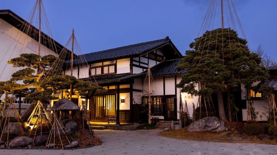 チェックイン開始の15:00になったので、「天童荘」へ。松の木が配された庭をはじめ、日本の伝統美が息づく美しいたたずまいに心も沸き立ちます。取材したのは、細雪がはらはらと舞い落ちる師走。樹木には枝が折れないよう、雪吊りが施されていました。
