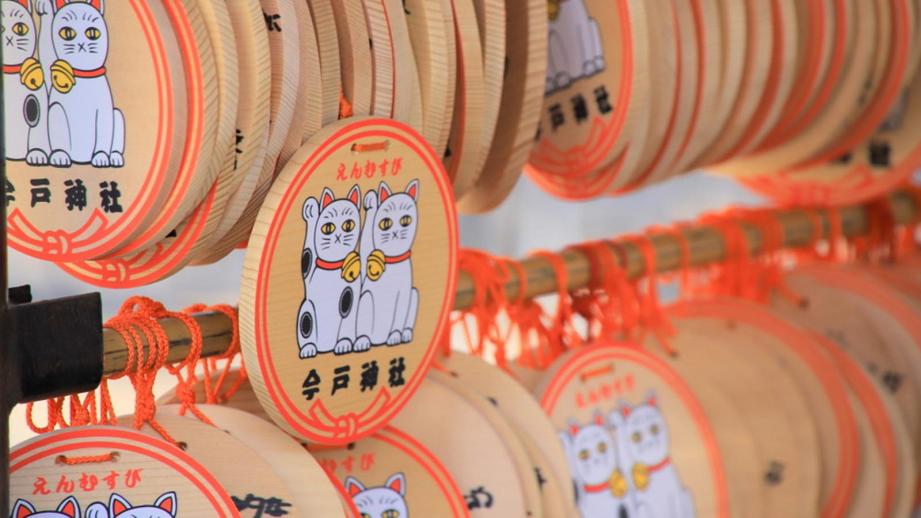 絵馬の招き猫はオリジナルのデザイン。お願い事用とそのお願い事が叶ったら成就を感謝する用の2種類があり、ぜひ2種類とも揃えて結びたいものです。