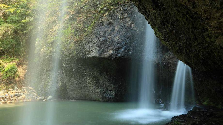滝裏を歩く「くぐり滝」で大量のマイナスイオンを浴びながら開運を祈願してみるのもおすすめです。月待の滝は普段は二筋の夫婦滝ですが、水量が増えると子滝が現れて三筋の親子滝となります。