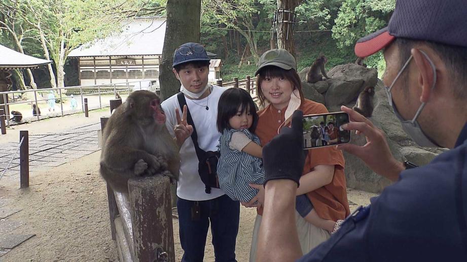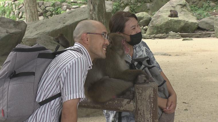 高崎山の歴史の中でも初めてだという“2ショットザル”のマルオ。多い日は100組以上と撮影するということです。