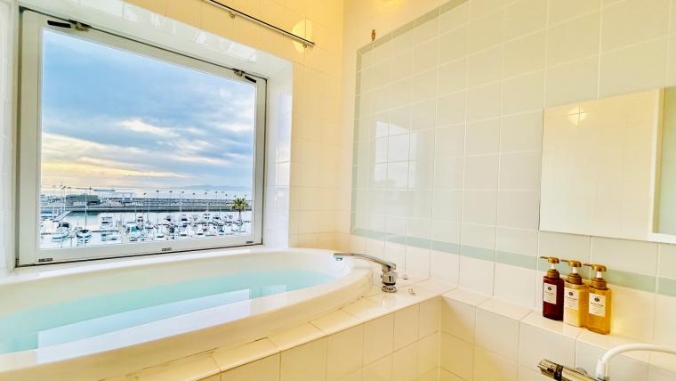 また、スタンダードルームを除くすべての客室には「オーシャンビューバス」を完備。浴室の窓からヨットハーバーを望め、楕円形のバスタブやアーチ型の蛇口が、リゾート気分をより一層引き立てます。窓を開ければ潮風が心地よく入り込み、半露天のような開放感の中での入浴も楽しめます。