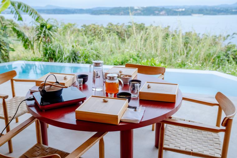 長閑な海や広い夕暮れの空、浮かぶ島の影を眺めながらの食事は、味覚も研ぎ澄ませてくれるようです。滋味あふれる沖縄の食材を噛み締めながらじっくりと味わっていると、心と身体が自然とつながり癒やされていく感覚を覚えます。みんなで食卓を囲んでわいわいと楽しめば、明日からの元気もみなぎってきました。