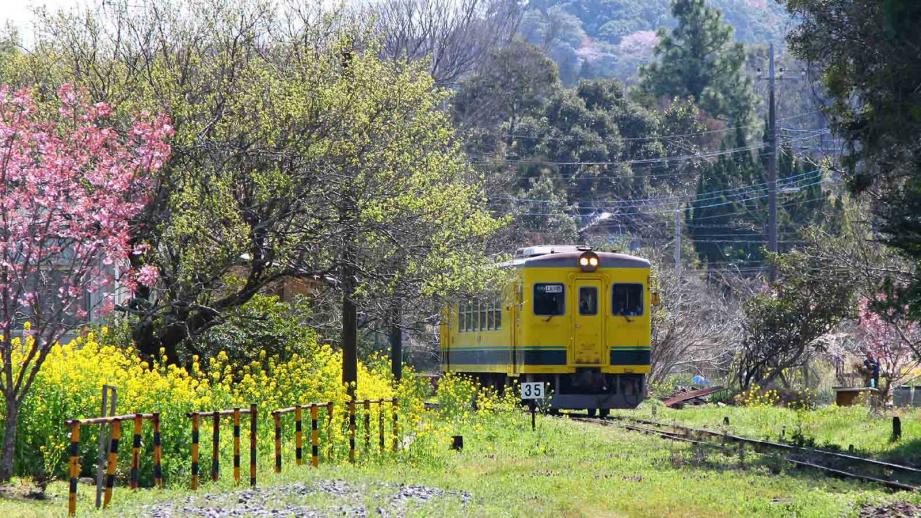 いすみ鉄道の黄色い車両がやってきました。いすみ鉄道は、上総中野から外房の大原駅までを結ぶ約26.8kmの路線。車両の後ろドアから車内に入って整理券を取り、降りる時に運転手側の運賃箱へ料金を支払うという、バスのような乗り方をします。