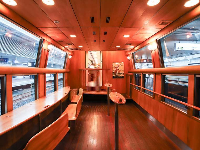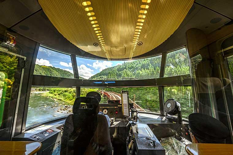そして、最前部と最後部には展望席も。180℃広がる大パノラマは迫力満点! これぞ列車旅といった風情が味わえます。1車両に8席だけ(最前部4席・最後部4席)の人気席なのでご予約はお早めに。