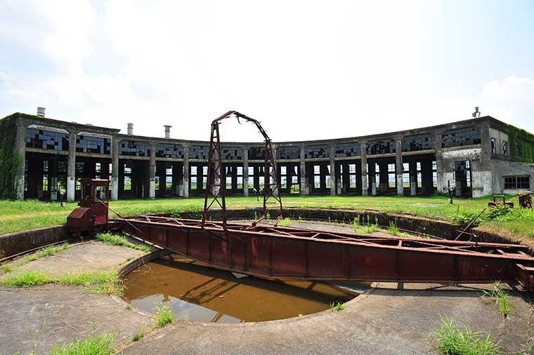 この地は、かつて久大線の重要な中継ポイントとして栄え、機関車の車庫が置かれていました。やがて蒸気機関車が姿を消し、この車庫も廃止されましたが、現在でも、機関車を車庫に導く転車台、扇形の機関庫が残されていて、車内から見ることができます。国の登録有形文化財、近代化産業遺産にも認定されています。