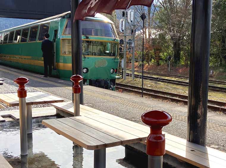 博多から由布院に向かう場合、天ケ瀬駅を出たら右側(D列側)に注目! 道路の奥に2段落としの滝、「慈恩(じおん)の滝」が見えてきます。付近には、趣あふれる温泉や温泉旅館もたくさんあるので、時間に余裕があれば、途中下車して観光するのもおすすめです。