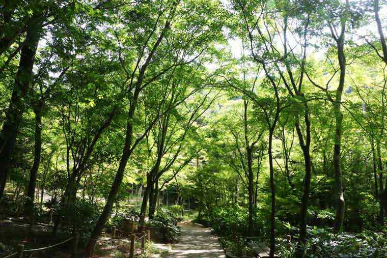 炭酸泉源公園から歩いて10分ほどのところには「瑞宝寺(ずいほうじ)公園」があります。夏は美しい深緑を楽しめる場所、秋は紅葉の名所として多くの人でにぎわいます。