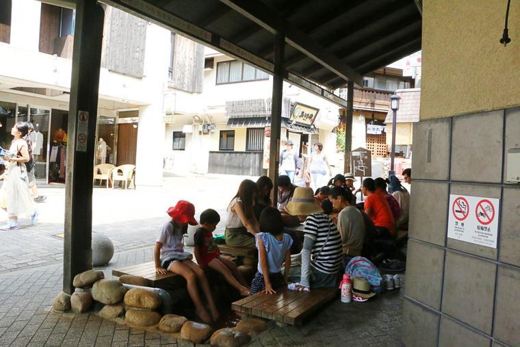 金の湯のすぐ横には無料の足湯があります。足をつけると金色のように見えます。金の湯は塩分濃度が高く、少し高めの湯温なので、保温効果が高く、つかったあとは足がぽかぽかと温まっている感覚に。外の風が心地よく当たってすっきりした気分になります。