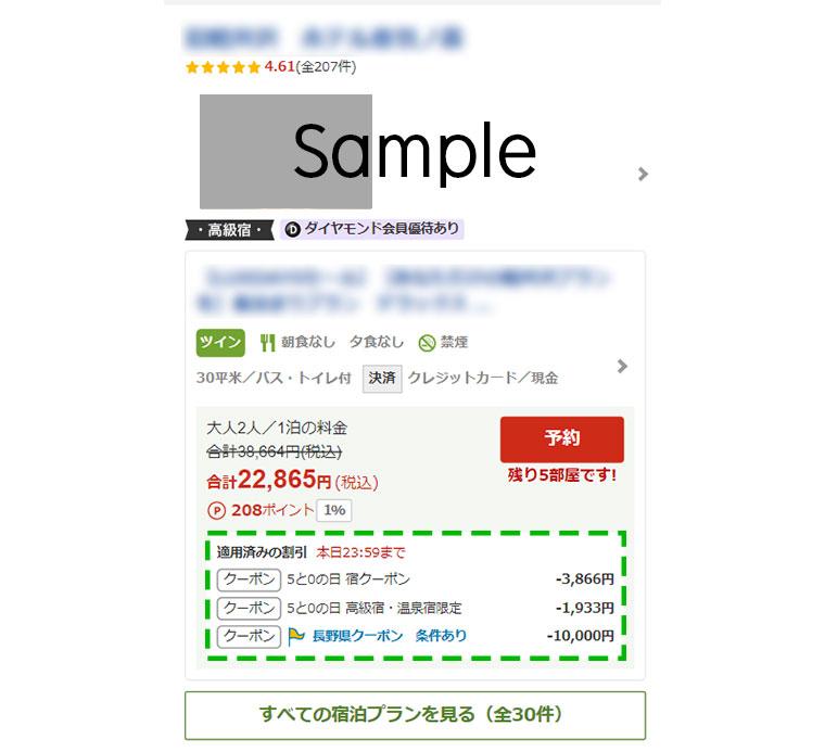 クーポン名のとおり、「5日、10日、15日、20日、25日、30日」に予約をすると高級宿もしくは温泉宿が5%OFFとなり、一部の施設はさらに10%OFFクーポンが使えるので、最大で合計15%OFFとなります!