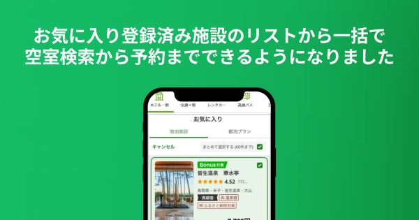 お気に入り登録済み施設のリストから一括で空室検索から予約までできるようになりました 2026/02/17 楽天トラベルでは、お客さまより頂いたご意見・ご要望を真摯に受け止め、より良いサービスを提供できるよう、日々改善に取り組んでいます。このページでは、お客さまの声をかたちにした改善事例の一部をご紹介いたします。