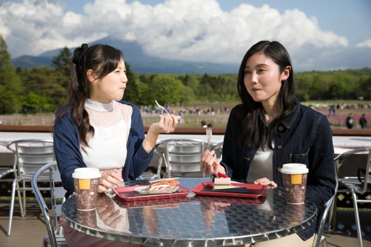 絶景を見ながらまったりとしたひと時を過ごしたい時は、会場内にある「展望カフェ」がおすすめ。芝桜と富士山が一望できる上に、ホテルパティシエ特製の本格スイーツ”を味わえるのも魅力的なポイントです。