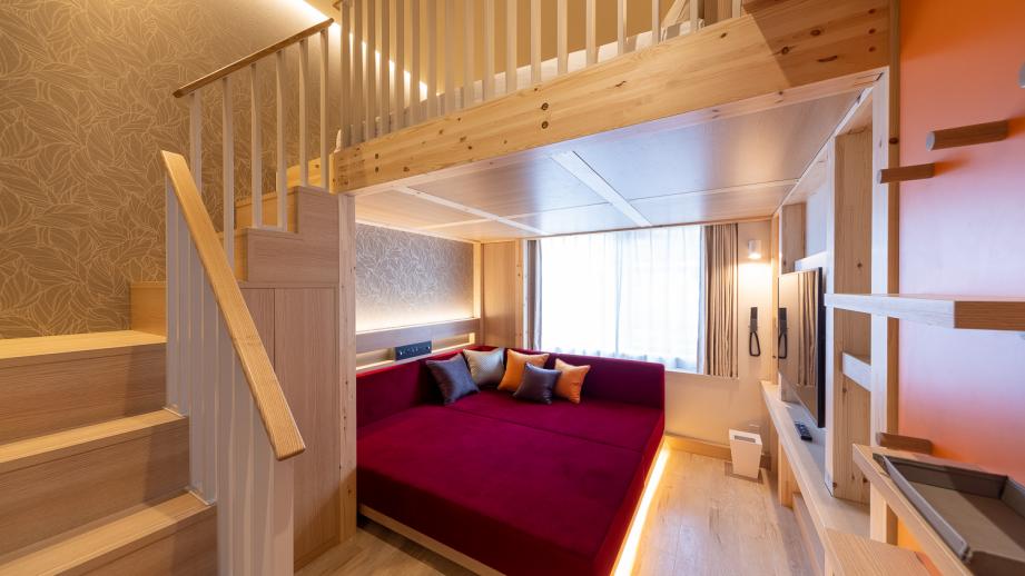 虹館の客室は、広さ約21平米のお部屋を中心とした全155室。同ホテル初となるメゾネットタイプの「ロフトルーム」や、2段ベッドを配した「ファミリールーム」など全5タイプが用意されました。