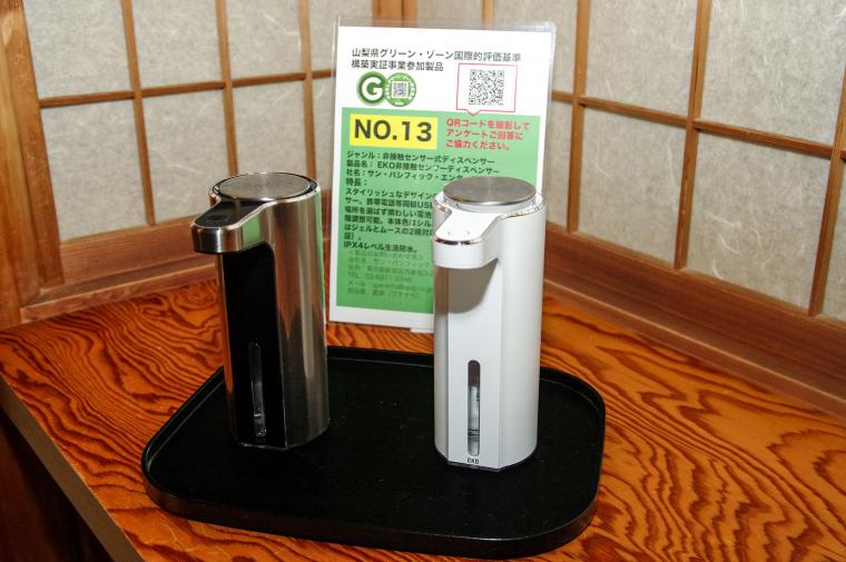 甲府市「常磐ホテル」、笛吹市「糸柳」、富士河口湖町「富士レークホテル」の3軒の宿泊施設で実施される実証実験。非接触チェックインシステムや空間除菌装置、コーティング剤など、第三者検査機関で新型コロナウイルスに効果があると示されたものを導入し、実際の運用のなかでの効果を検証します。