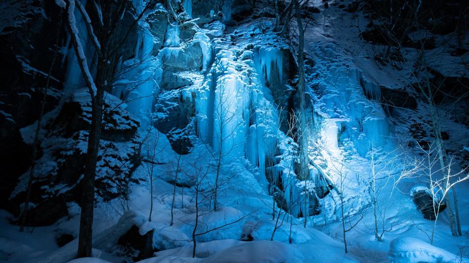 専用のライトカーとセットで運行する「冬の奥入瀬氷瀑ナイトツアー:市街地・焼山発着ツアー」(2021年12月17日~2022年3月6日 木~日・祝日運行)&「冬の奥入瀬氷瀑ナイトツアー:十和田湖発着ツアー」(2021年12月17日~2022年2月20日 金~月・祝日運行)では、ライトアップされた5カ所の氷瀑や氷柱などを観賞します。幻想的に浮かび上がる「氷瀑」の青みを帯びた美しさは夜でもはっきりとわかるほど。まるで時間が止まっているかのような感覚を味わえるのではないでしょうか。