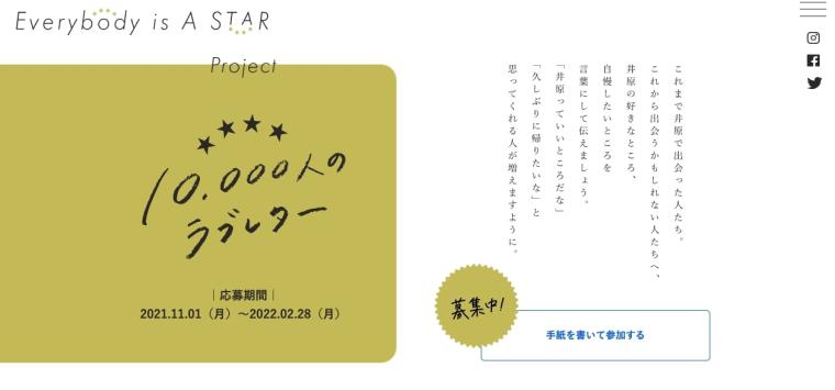 また井原市では認定を機に、市民参加型の地方創生プロジェクトを始動。「市の魅力」をより発信していくのが目的で、井原市への想いや愛着をラブレター形式で募集する「1万人のラブ☆レタープロジェクト」を開催中です(2022年2月28日まで)。他にも井原の魅力を詰め込んだフォトブックを制作する「カメラ女子によるステイケーション」や、天文を学んで星空を愛でるバスツアー「星空ピクニック」など様々なプロジェクトもおこなう予定。気になる人はぜひチェックしてみてください。
