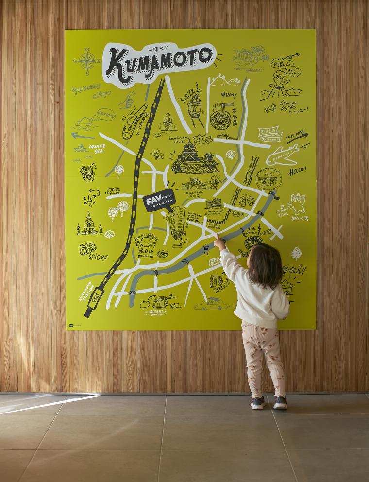 ちなみにロビーには、熊本市内の人気観光地をイラストにしたグラフィカルなマップアートも展示。「旅の目的地を決めるお手伝い」を目的として、人気クリエイティブグループ「Bob Foundation」(ボブファンデーション)との特別コラボレーションが実現しました。