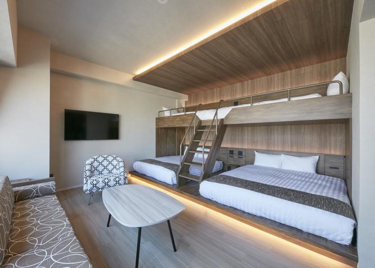 肝心の客室は大人数で宿泊しても窮屈さを感じさせない快適な空間を用意しており、グループステイが可能な「バンクベッド(2段ベッド)」が特徴的です。