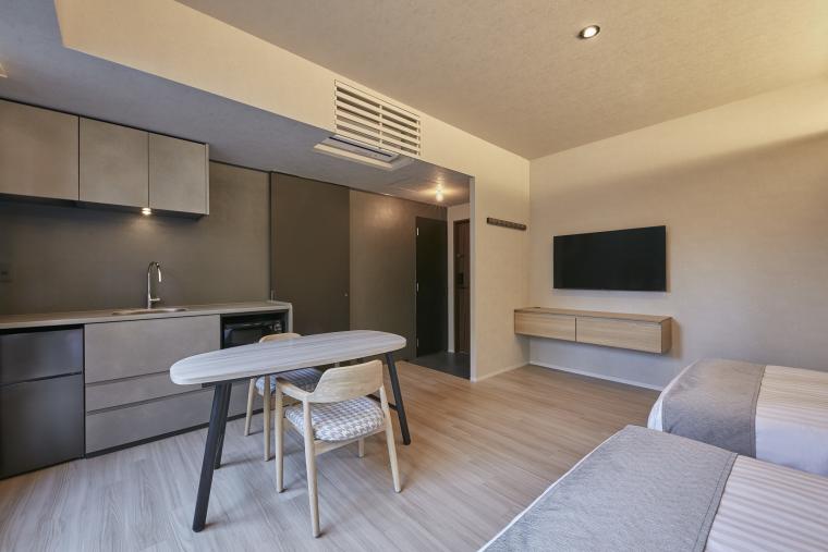 さらに自宅で過ごすような客室環境「HOTEL Like HOME」を目指しているので、各部屋にはキッチン、洗濯機、冷蔵庫、カードキーが不要な暗証番号式の客室ロックを完備。木目を基調としたぬくもりのある空間は、「ダークカラーで整えた水回り」や「ファブリック柄を取り入れた家具」など部屋全体のデザインにもこだわりが見られます。