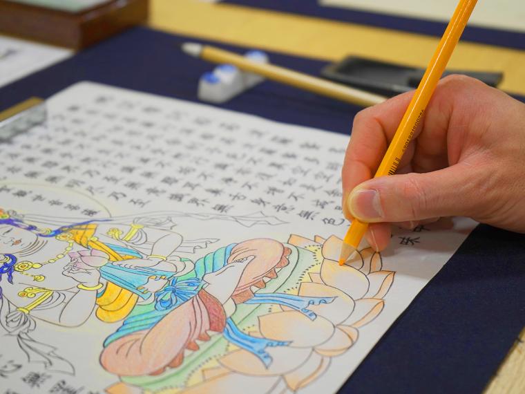 また「和空 下寺町」では、新しい写経の形「絵写経」を体験できるのもポイント。「絵写経」とは日本文化として根付く「写経」と仏さまの姿を移す「写仏」を融合させたもので、心の赴くままに筆を動かせば「無心の時間」を過ごせますよ。