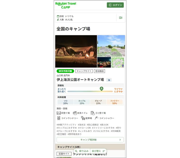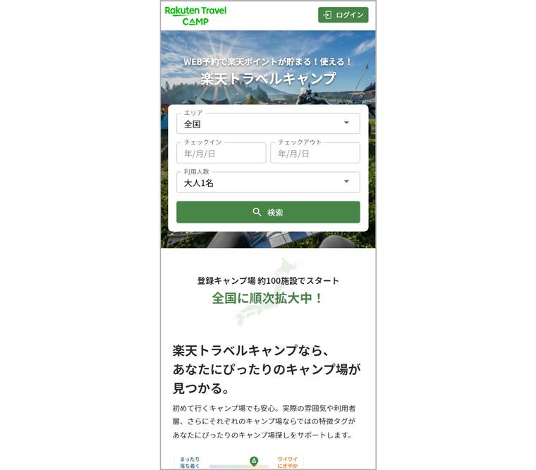 全国のキャンプ場を検索・予約できる「楽天トラベルキャンプ」では、都道府県や日時、利用人数などを指定し、全国のキャンプ場から条件に合うものを見つけることができるサービスです。