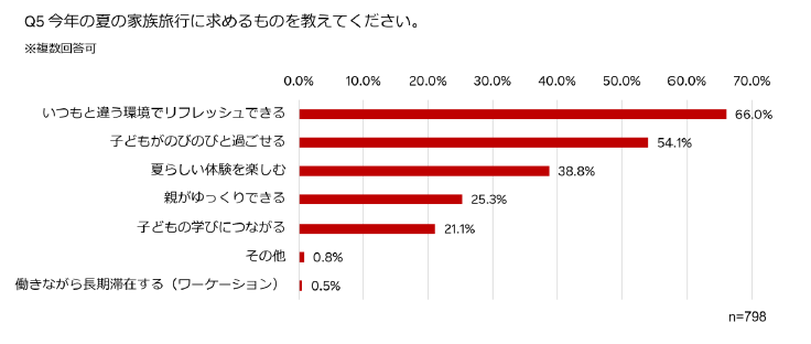 「今年の夏の家族旅行に求めるものは?」との複数回答可の問いでは、「いつもと違う環境でリフレッシュできる」(66.0%)が最も多く、次いで、「子どもがのびのびと過ごせる」(54.1%)、「夏らしい体験を楽しむ」(38.8%)などの回答が寄せられました。