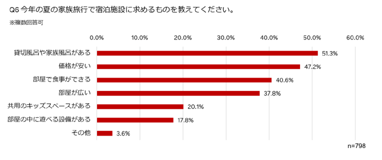 さらに、今夏の家族旅行で宿泊施設に求める条件としては、51.3%が「貸切風呂や家族風呂がある」と回答。「部屋で食事ができる」(40.6%)、「部屋が広い」(37.8%)との回答も多く、プライベートな空間や広い客室でくつろげる旅行が求められている傾向も見て取れました。