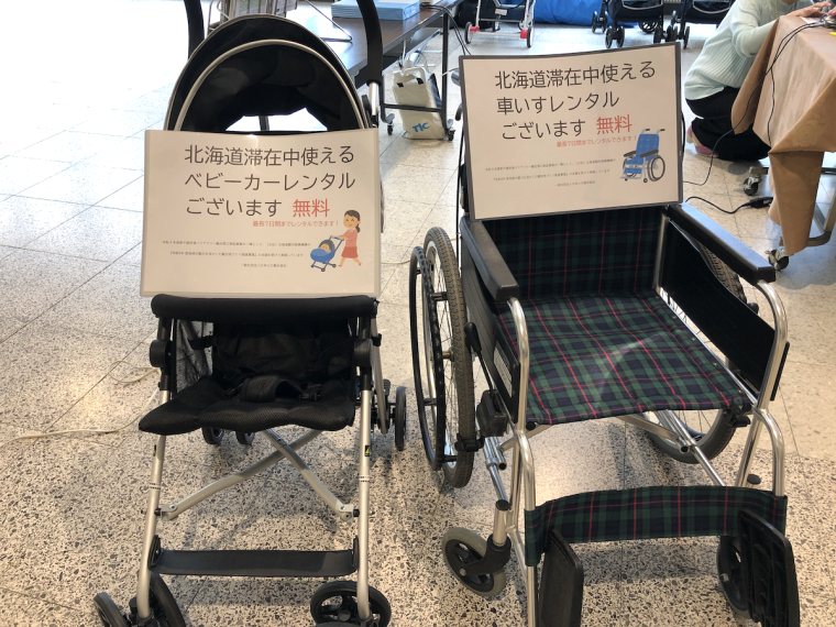 車いすやベビーカーのレンタル(※)ができるのもうれしいポイント。レンタルは完全予約制となっていて、HPの予約フォームまたは電話で事前予約しておけば、無料でレンタルできます。なお、車いすとベビーカーは貸し出し・返却ともに新千歳空港「しょうがい者・こうれい者観光案内所」でおこなっています。