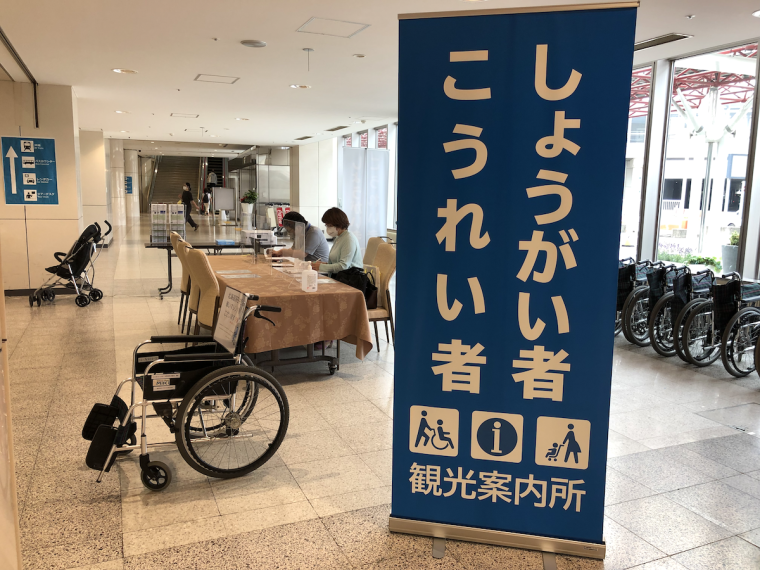 「しょうがい者・こうれい者観光案内所」は、9月25日までオープン予定。設置場所は空港ターミナルビル1階到着出口1と2の間で、青のバナー(のぼり)が目印です。