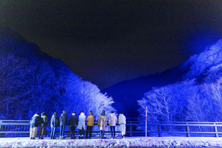 市街地・焼山発着または十和田湖発着の「冬の奥入瀬氷瀑ナイトツアー」では、ツアーバスと一緒に専用のライトカーが運行し、奥入瀬渓流の5つの名所をライトアップ。鑑賞するスポットごとに異なる演出コンセプトを感じながら、幻想的に照らし出される氷の造形美を楽しめます。なお、ナイトツアーにもネイチャーガイドが乗車します。