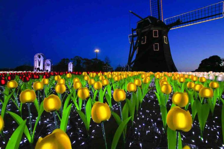 夜にきらめくイルミネーションとチューリップがコラボした花畑「光のチューリップガーデン」も必見です。音楽とともに幻想的なチューリップのライトが咲き並び、日中とは違った表情を見せてくれます。