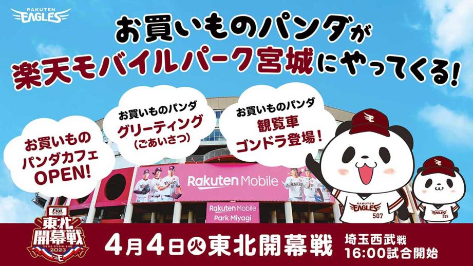 東北開幕戦ではお買いものパンダとのグリーティング(ごあいさつ)イベントも開催され、楽天イーグルスのホームユニフォームを着たお買いものパンダと触れ合えます。さらに、楽天イーグルスのコラボグッズも販売される予定です。