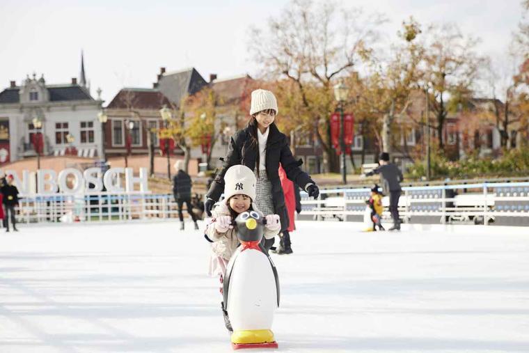 もちろん、純白のスケートリンクやヨーロッパの美しい街並みをバックに写真を撮るのもおすすめ。気分もぽかぽか温まり、冬の寒ささえ吹き飛んでしまいそうです。スケート靴や頭部・肘膝プロテクターに加え、キュートで楽しい氷上遊具もレンタルが可能。はじめてでも気軽に楽しむことができます。