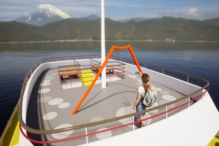 船体外側の鶴や結び目をモチーフとした水引風オブジェや4階最上階の富士山モチーフモニュメントなど、日本文化や地域の自然に呼応するディテールも。富士山や芦ノ湖の自然や、箱根神社の鳥居などをバックに、撮影にもぴったりです。