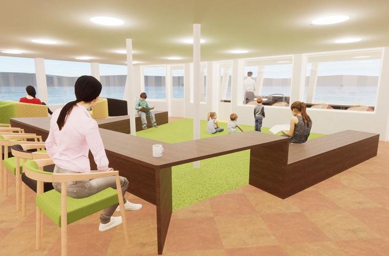 船内には赤富士をイメージしたソファ席や「ブランコ風」ベンチ、ハンギングチェア、小上がり席にカウンター席と、多彩なタイプの座席を用意。靴を脱いでくつろげるキッズスペースもあり、大きな窓越しに操舵室を眺めることもできます。