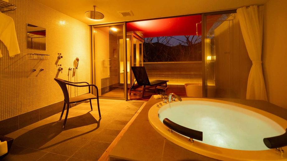 客室に入って目に飛び込んでくるのは、客室専用半露天風呂とロウリュ式のプライベートサウナです。開放感たっぷりの空間にジェットバス付きの半露天風呂があり、湯船に浸かると中庭越しに刻々と変化する里山の夕景が楽しめます。