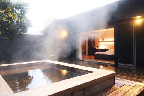 大きなワイドキングベッドが置かれた寝室と、露天風呂のあるデッキがつながっているのも魅力。穏やかな風を感じながら温泉で疲れを癒やした後は、そのままベッドにもぐり込み、心ゆくまでくつろいでみては。