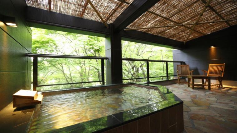 客室はスタンダード、スイートの2タイプで構成され、全室に「強羅温泉」を使用した露天風呂を完備。箱根外輪山やイタリ池を望む開放的な湯浴みを堪能できます。専用テラスで涼みながら、お酒やドリンクを片手にゆったり過ごすのもおすすめです。