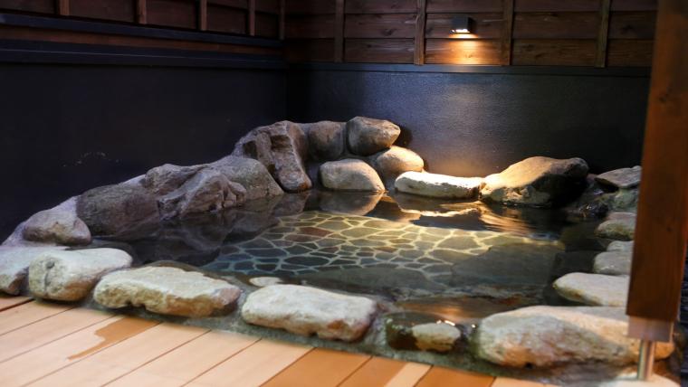 大浴場と客室露天で2種類の温泉を湯めぐり。溶岩焼が名物の創作和会席も